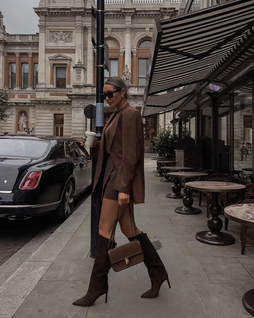 12. Tonal Sophistication: Brown Blazer and Brown Outfit with Pointed-Toe Boots