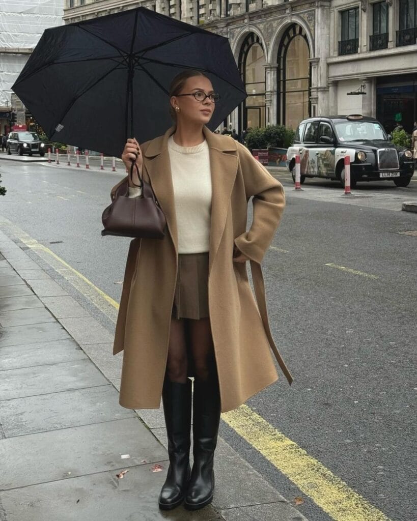 1. Cozy Chic: Long Coat, Sweater, and Pleated Mini Skirt with Boots