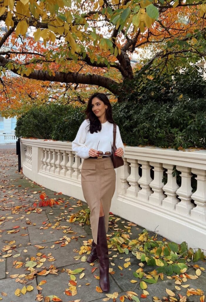 @ sophiemouldsFor a sleek, modern look, pair a white sweater with a pencil leather skirt. Knee-high boots add a chic, polished touch, making this outfit perfect for a stylish office look or an elevated casual day out.