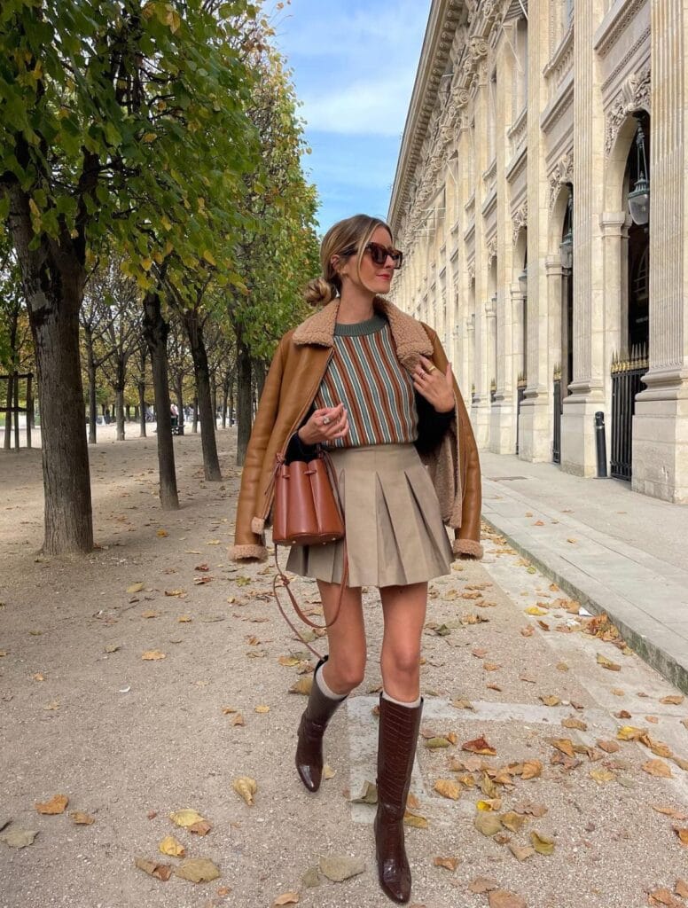 18. Casual Cool: Warm-Toned Leather Jacket with a T-Shirt and Pleated Skirt