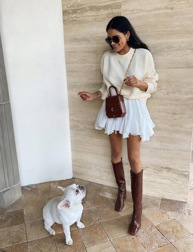 19. Cozy Charm: Knit Sweater with a Mini Skirt and Brown Boots