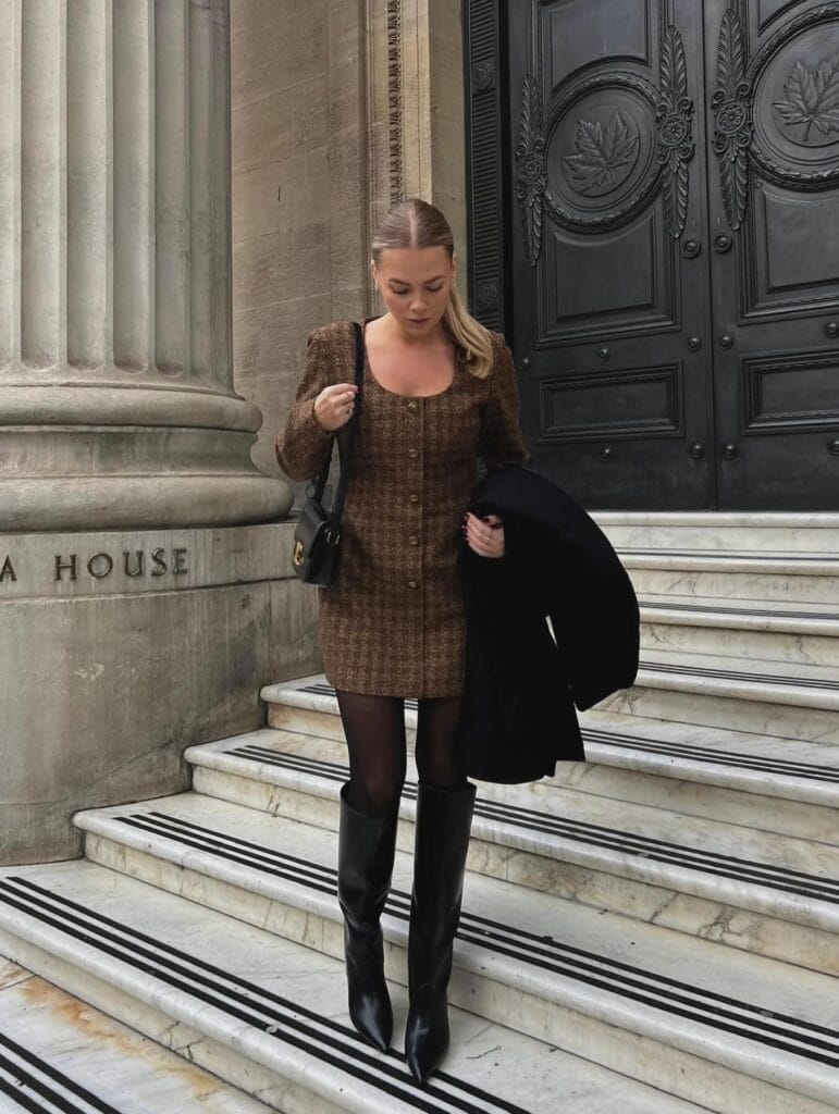 4. Classic Charm: Pointed-Toe Boots and Brown Check Mini Dress