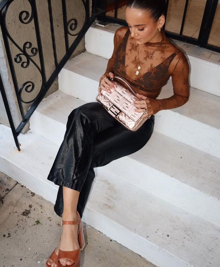 11. Sheer Brown Lace Long-Sleeve Top with Leather Pants