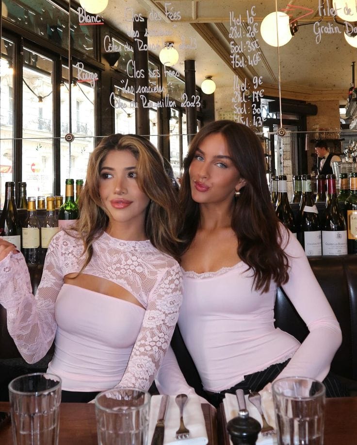 Both wear soft pink lace long-sleeve crop tops with cut-out shoulders and scalloped edges.ā The sheer design layers beautifully for a playful bistro-ready look.ā