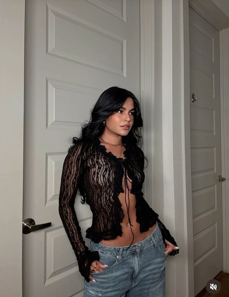 She’s turning heads in this sheer black lace long-sleeve top with sultry cut-out shoulders and dramatic flair sleeves. Paired perfectly with high-waisted flared blue jeans that hug and flow for that ultimate street-style edge.