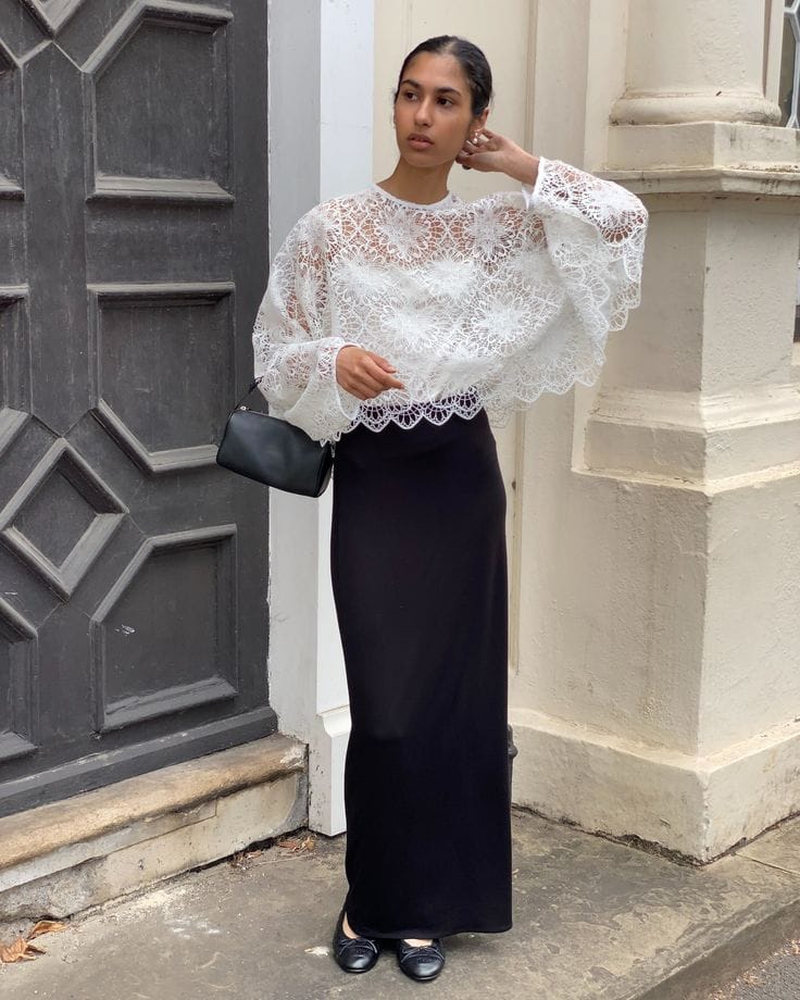 Oversized white lace blouse with sheer overlay, crew neck, and dramatic bell sleeves.ā Sleek black midi pencil skirt provides a tailored base for high-contrast chic.ā