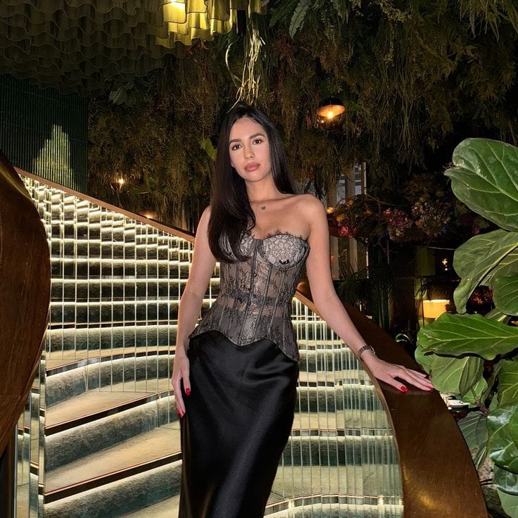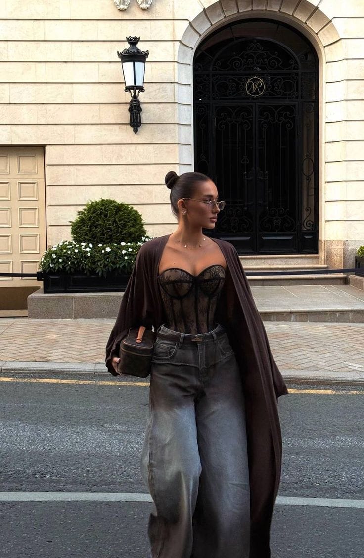 āShe’s serving sultry vibes in a black lace corset top with delicate detailing, layered under an open long cardigan.ā Flared blue jeans complete the look, adding a casual edge to the romantic silhouette.