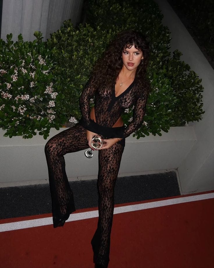 This bold lace top outfit features a sheer black lace long-sleeve top with a deep V neckline, perfectly paired with matching lace pants for a sleek, coordinated look. The all-black lace silhouette feels sultry yet polished, making it a statement choice for nights when you want your outfit to do all the talking.