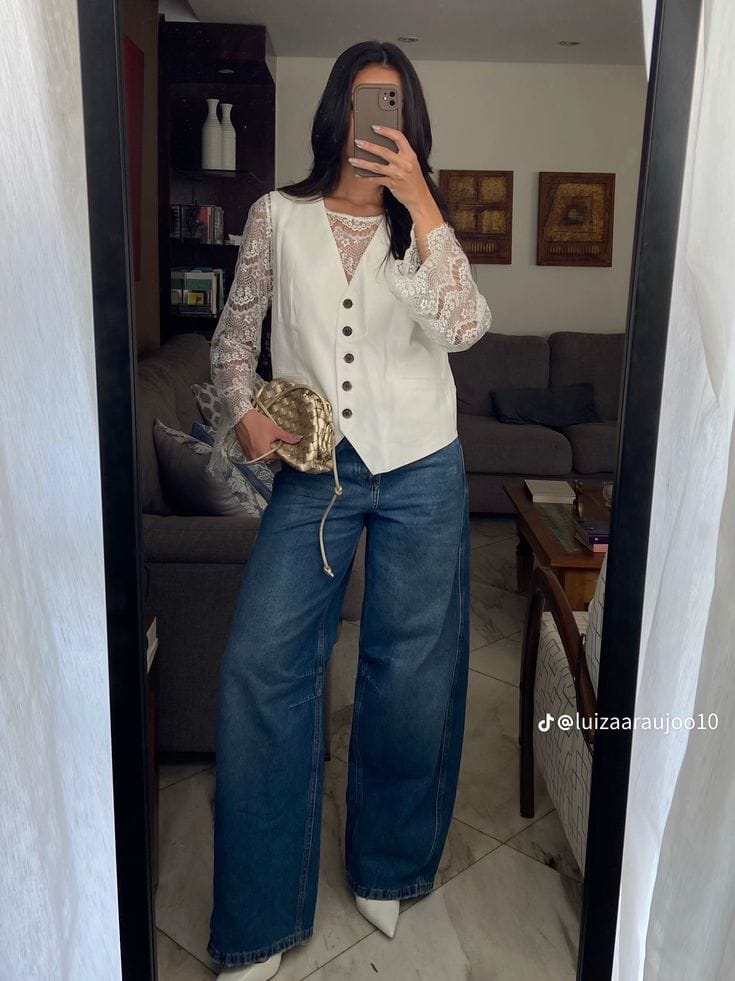 7. Chic White Lace Long-Sleeve Vest with Flared Blue Jeans