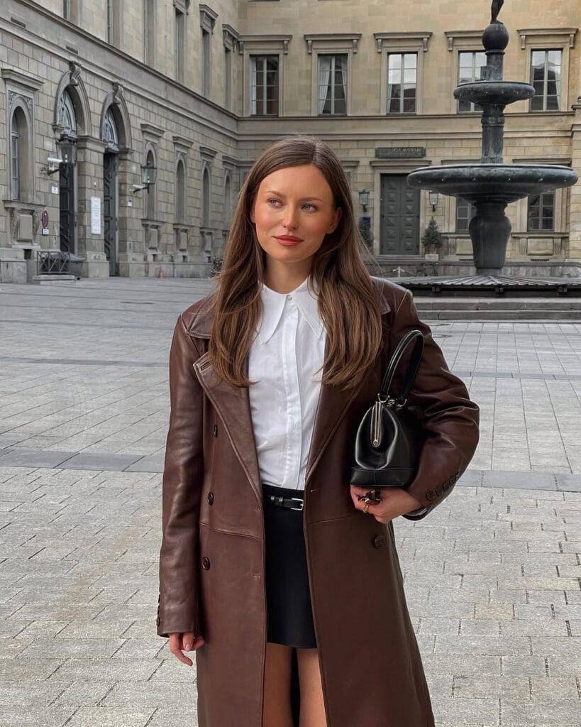 @ livia_auerSheās sporting a luxe dark brown leather trench layered over a crisp white button-up and a sleek black mini skirtāclassic, modern, and totally effortless. This look is polished yet playful, perfect for strolling around the city or grabbing coffee with friends!