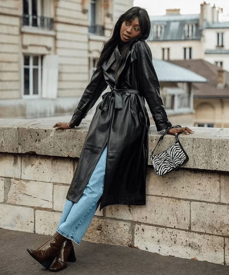 Sheās making a statement in a sleek long black leather trench, casually paired with light-wash straight jeans. I love how the look gets even more city-cool with the brown heeled boots and a fun zebra-print bagāthis combo seriously turns every sidewalk into a runway!