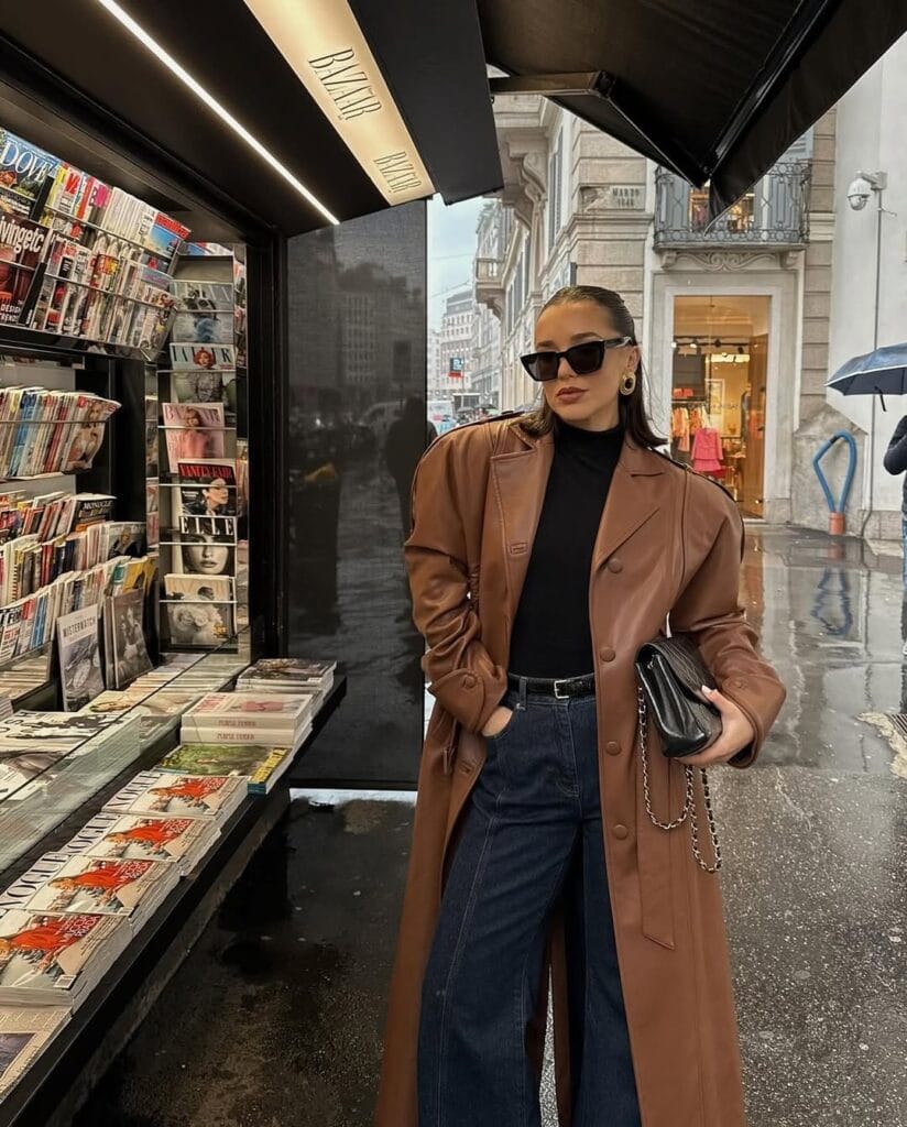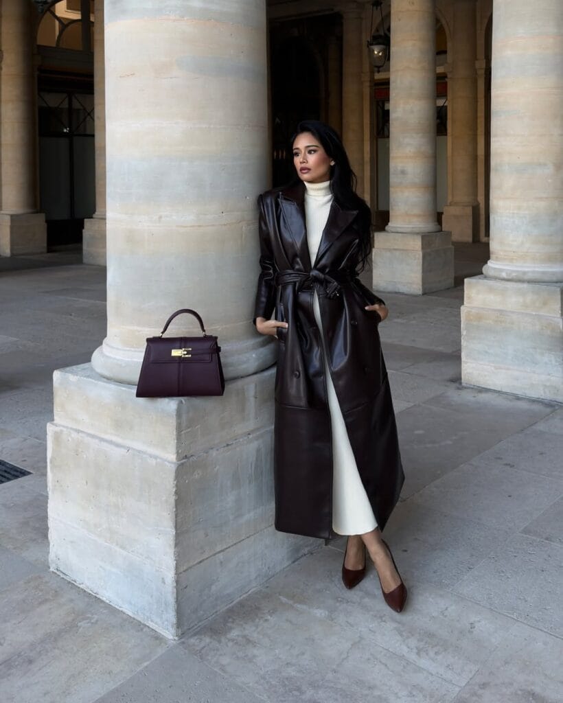3. Elegant Espresso Leather Trench & Cream Knit