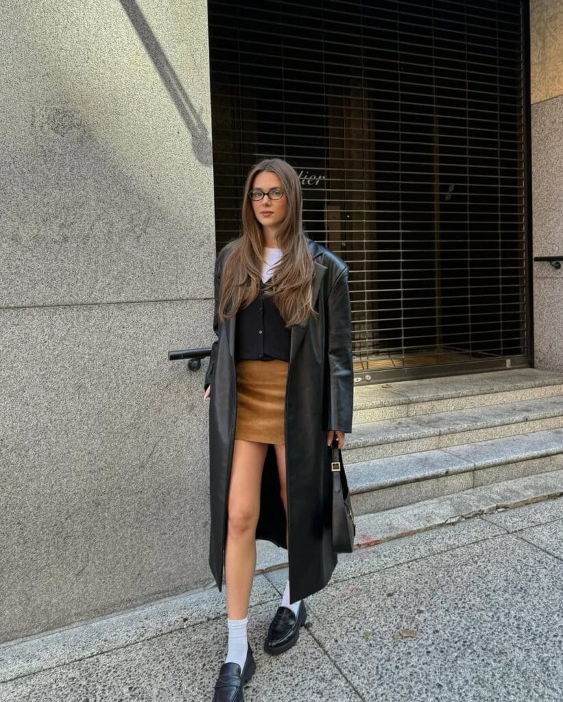 She’s rocking a sleek long black leather trench, styled with a brown suede mini skirt, crisp white tee, and a classic black vest layered over. The mix of textures and those preppy white socks totally elevate this city-cool vibeāsuch a fun, modern twist on classic fall dressing!