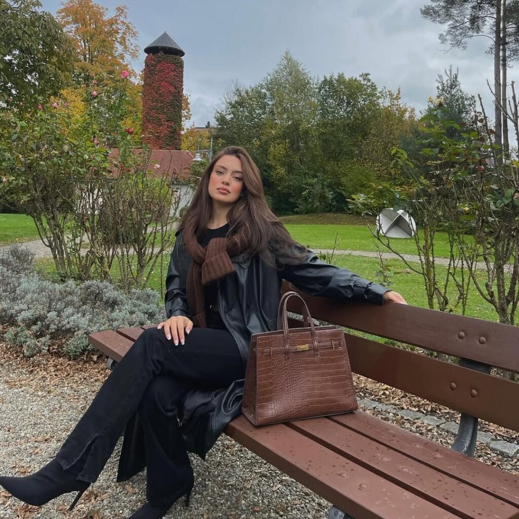 @ dilekpacaciogluSheās exuding cool-girl vibes in a long black leather trench, casually layered over a black top and wide-leg black pants, with a chunky brown scarf to keep things cozy. This look is effortlessly chicāperfect for crisp autumn days at the park!