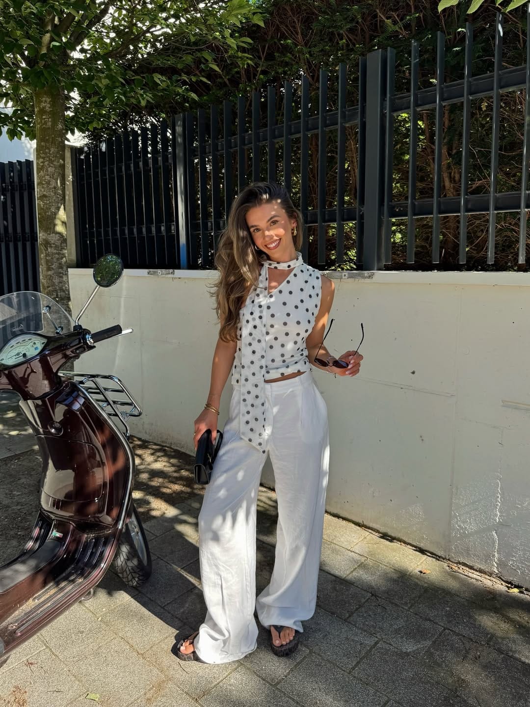 1. The Polka-Dot Tie-Neck Top and White Linen Trousers