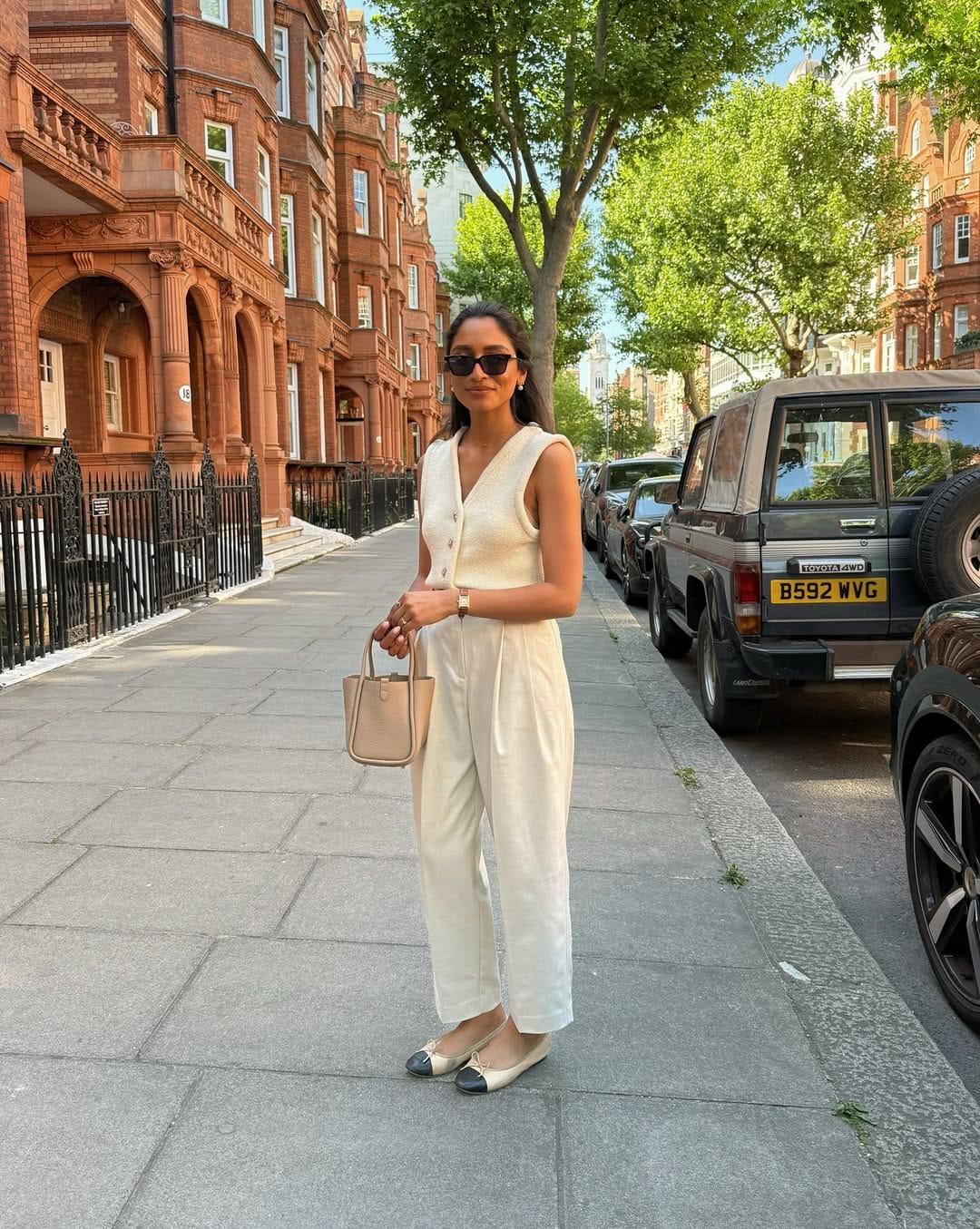 A cream sleeveless V-neck button-front knit vest is paired with wide-leg cream tailored trousers in a slightly warmer ivory tone, finished with two-tone cream and black cap-toe Chanel-style ballet flats, a small structured tan bucket bag, pearl stud earrings, and a gold watch. The two-tone ballet flats are the detail that gives this tonal cream outfit its entire personality — the black cap toe introduces a precise dark note at the base of the silhouette that sharpens the look and stops the all-cream palette from dissolving without the need for any other contrast accessory. I love this for a May afternoon in London when the sun is finally out and you want to look quietly impeccable.