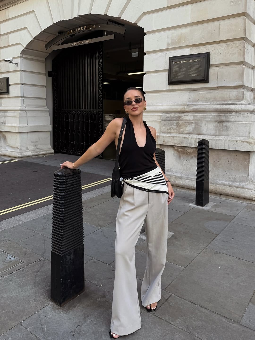 A fitted black ribbed halter neck top is paired with wide-leg cream tailored trousers featuring a bold black and white stripe waistband panel, finished with black patent pointed-toe heeled sandals, a black crossbody shoulder bag, and small gold square earrings. The stripe waistband panel is the architectural detail that makes these trousers exceptional — it creates a graphic contrast at the hip that gives an otherwise neutral trouser an identity, and the black halter top picks up the dark stripe in a way that makes the whole combination feel deliberately co-ordinated. I am completely obsessed with this for a May evening in the city when you want to look genuinely fashion-forward.