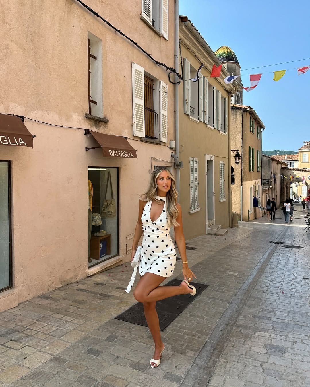 A white satin wrap mini dress with large black polka dots, a deep V-neckline, a self-tie waist, and a short asymmetric hem is finished with white strappy heeled mules, a gold chain necklace choker, and a gold bracelet stack. The deep V-neckline on a polka-dot wrap dress is the combination that makes this look feel genuinely retro and glamorous rather than simply printed — the wrap construction creates a waist and a diagonal line through the bodice that makes the large-scale dots look intentional rather than busy. My personal pick for a May evening in the South of France when you want to look like you belong there completely.