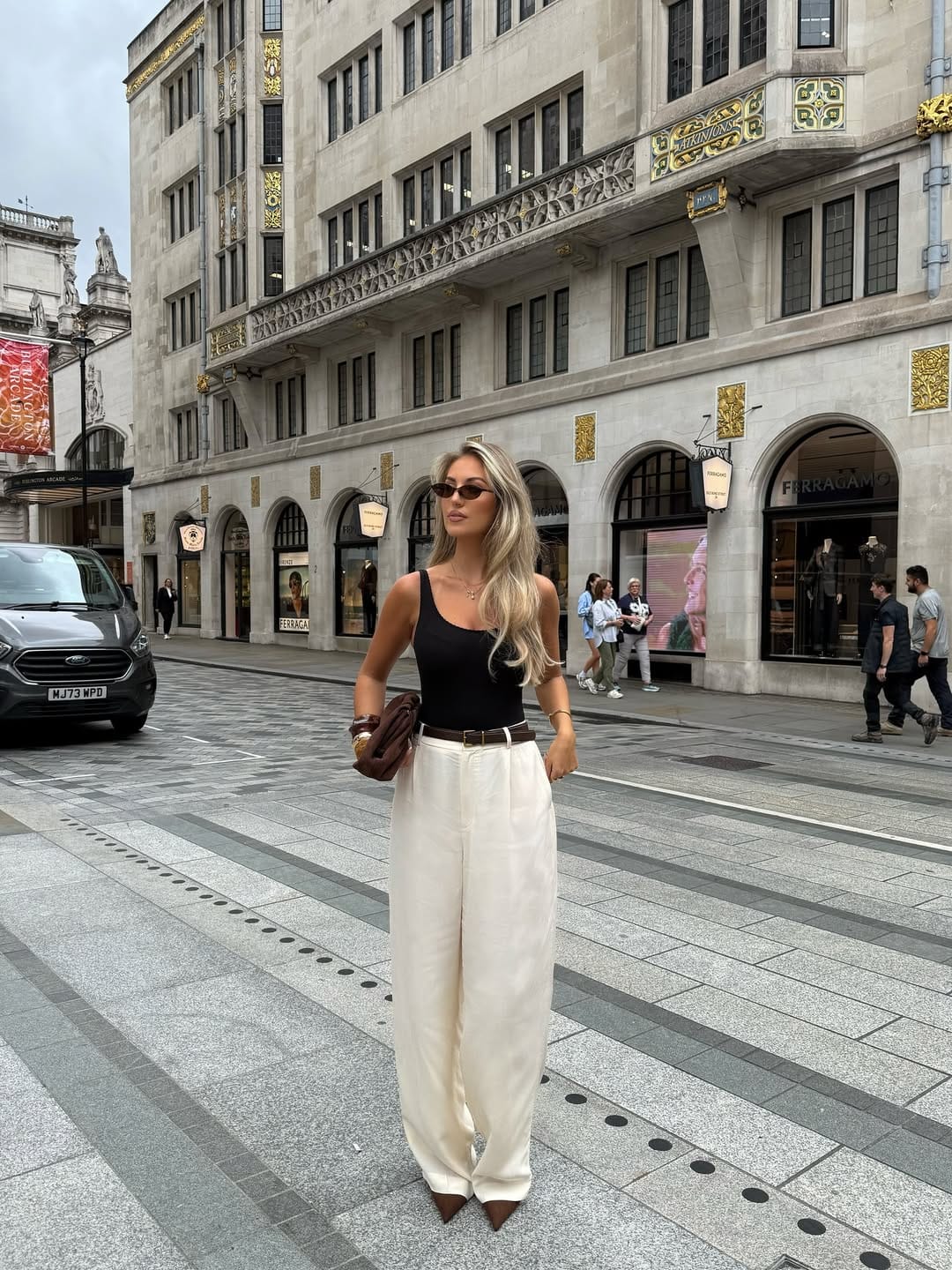 A fitted black scoop-neck tank is tucked into wide-leg cream tailored trousers, cinched with a slim tan leather belt, and finished with brown pointed-toe kitten-heel mules, a small burgundy leather clutch bag, and a delicate gold necklace. The brown mules and burgundy bag introduce a warm earthy tone that bridges the contrast between the black tank and cream trousers — without those accessories, the two-tone combination would feel stark, but with them it reads as warm, considered, and season-appropriate. I love this for a May afternoon on a London high street when you want to look put-together with absolutely no fuss.