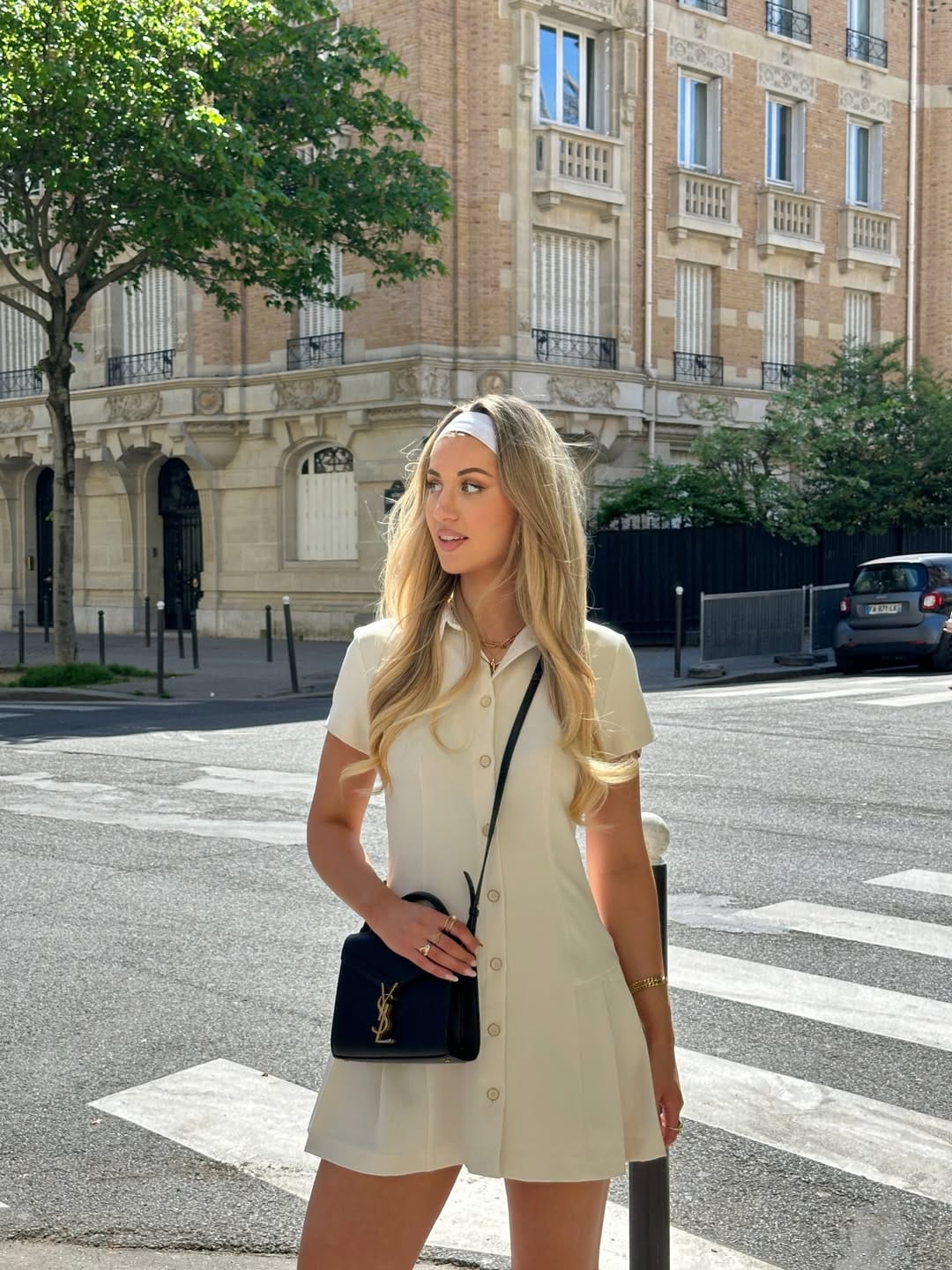A cream short-sleeve shirt dress with a collared neckline, front button placket, and a slightly A-line mini silhouette is finished with a small black YSL crossbody bag, a gold chain necklace, a gold bracelet, and a white satin headband. The white headband is the styling detail that gives this simple shirt dress its personality — it introduces a preppy, Parisian quality that makes a very minimal dress feel considered and characterful without adding any complexity to the outfit itself. I am obsessed with this for a warm May morning in Paris when you want to look French without trying.