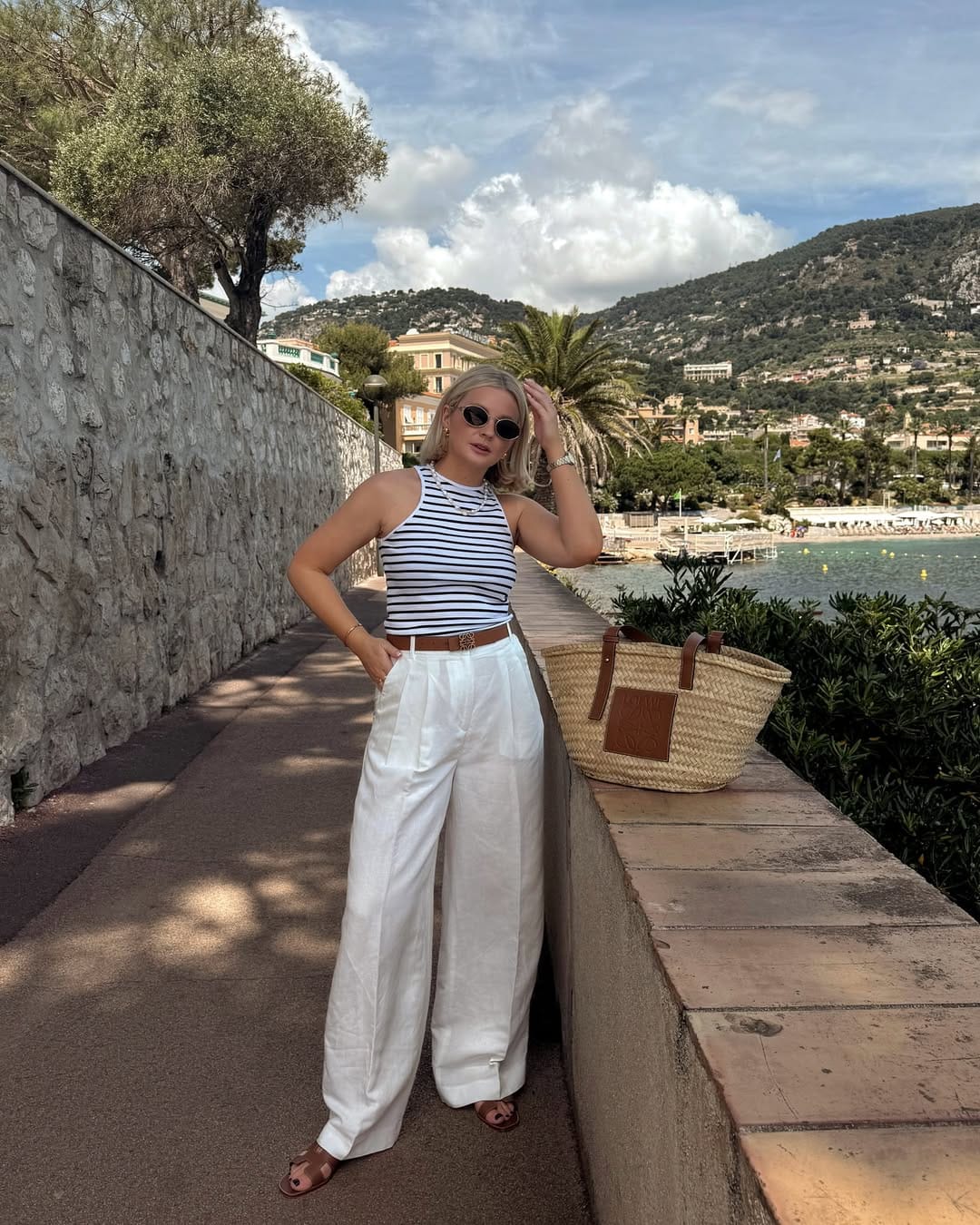 A fitted navy and white Breton-stripe racer-neck tank is tucked into wide-leg white linen trousers, cinched with a tan logo belt, and finished with tan flat leather thong sandals, a large woven Loewe-style basket tote, round sunglasses, and a silver chain necklace. The racer-neck cut of the stripe top is what modernises this classic nautical combination — it takes a heritage Breton stripe and gives it a clean, athletic edge that makes the wide-leg linen trouser feel fresh rather than predictable. What I love about this is how it works equally well on a boat or on a coastal promenade without any adjustment.