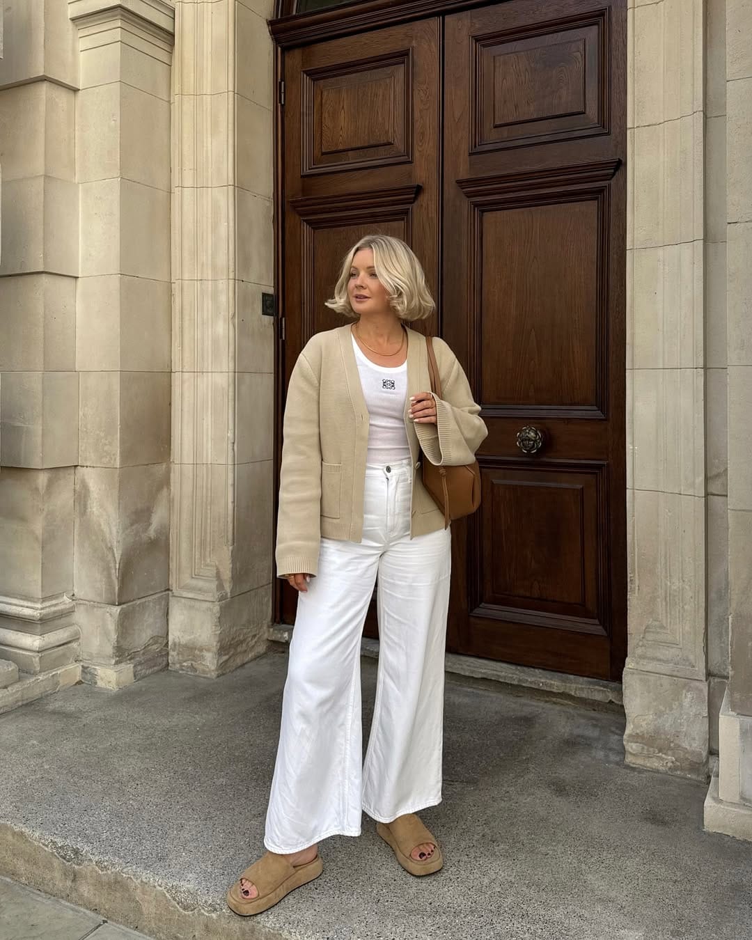 An oversized sand-coloured V-neck cardigan is worn open over a white ribbed logo tank top, paired with wide-leg white wide-leg jeans, and finished with camel platform suede slider sandals and a tan leather crescent shoulder bag. The platform sliders are the unexpected detail that stops this outfit from reading as simply comfortable — they add height and a fashion-forward proportion to an otherwise very relaxed combination of cardigan and wide-leg white denim. I love this for a cool May morning in the city when the sun has not yet decided to commit but you want to look considered regardless.