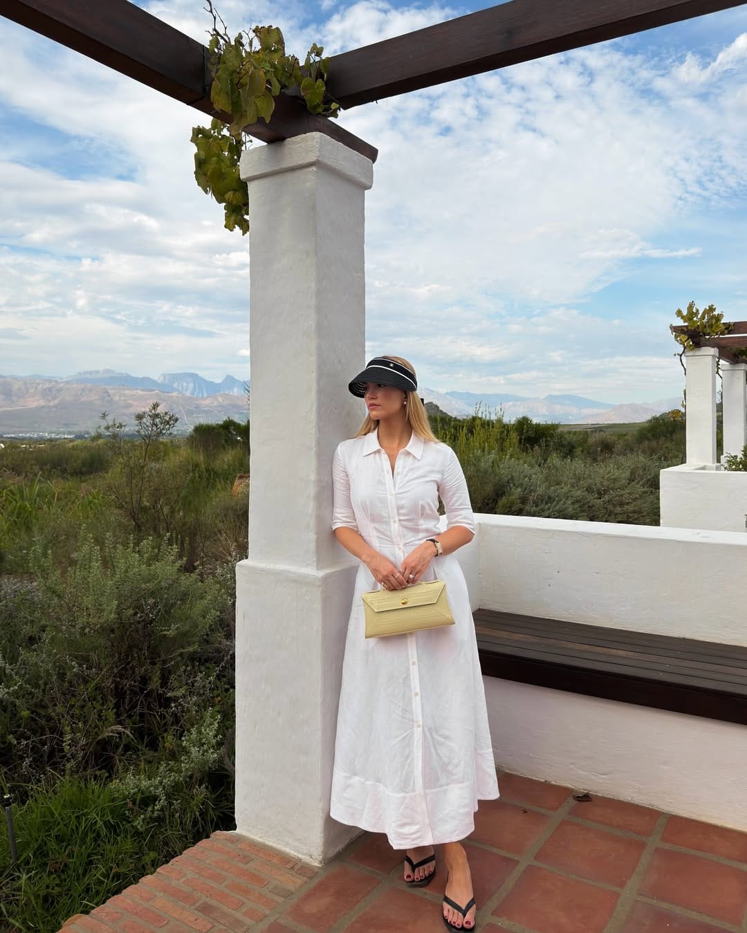 A white linen three-quarter sleeve shirt dress with a button-front placket and a gently flared midi skirt is finished with black flat thong sandals, a small yellow croc-effect envelope clutch, a silver watch, and a black and white stripe sun visor. The stripe visor is the unexpected accessory that lifts this very simple white dress into something with genuine personality — it introduces a sporty, resort-dressing quality that makes the clean linen silhouette feel deliberately styled rather than simply easy. I love this for a May morning at a vineyard or a countryside hotel when the sun is finally strong enough to need shading.