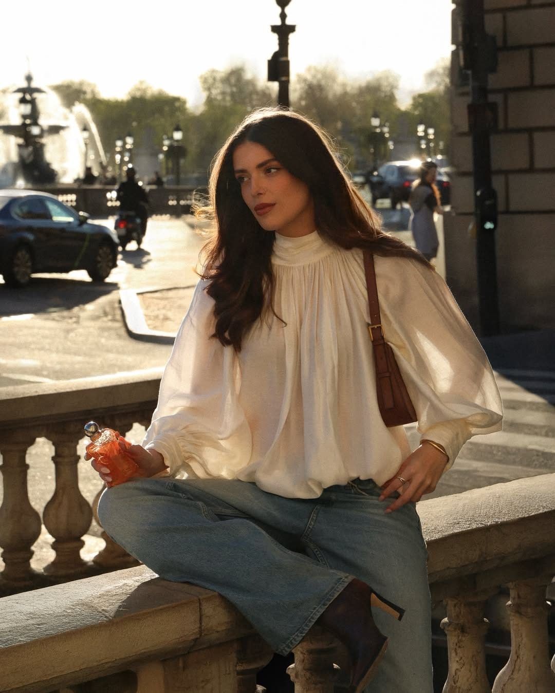 24. The Cream Voluminous Blouse and Wide-Leg Jeans