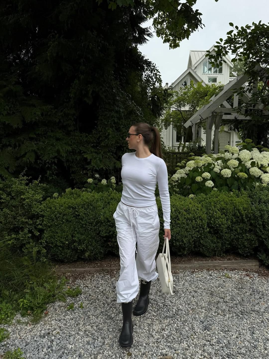 A fitted white long-sleeve crew-neck top is paired with wide-leg white parachute-style trousers with a drawstring waist and gathered hem, finished with black knee-high leather boots and a white Chanel tote bag. The black boots under the all-white parachute trouser are the contrast detail that makes this outfit work for May specifically — they add enough darkness and structure at the base to prevent the head-to-toe white from feeling ungrounded, while the relaxed parachute silhouette keeps the look firmly on the casual side of the season. I love this for a cool May day in a garden setting when the hydrangeas are in bloom and you want to look quietly beautiful against them.