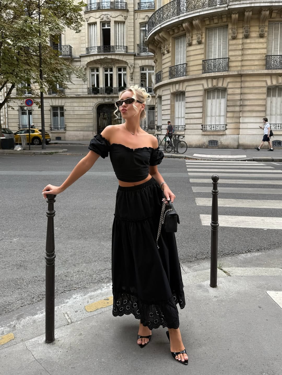 A black off-shoulder puff-sleeve crop top with a scalloped neckline edge is paired with a voluminous black cotton tiered maxi skirt with broderie anglaise cutwork detail along the hem, finished with black strappy heeled mules and a small black quilted chain bag. The broderie hem on the maxi skirt is what prevents this all-black combination from feeling heavy — the delicate cutwork introduces lightness and a handcrafted quality at the base of the silhouette that makes the whole look feel genuinely May-appropriate. I am completely obsessed with this for a Paris street or an evening out when you want drama without colour.