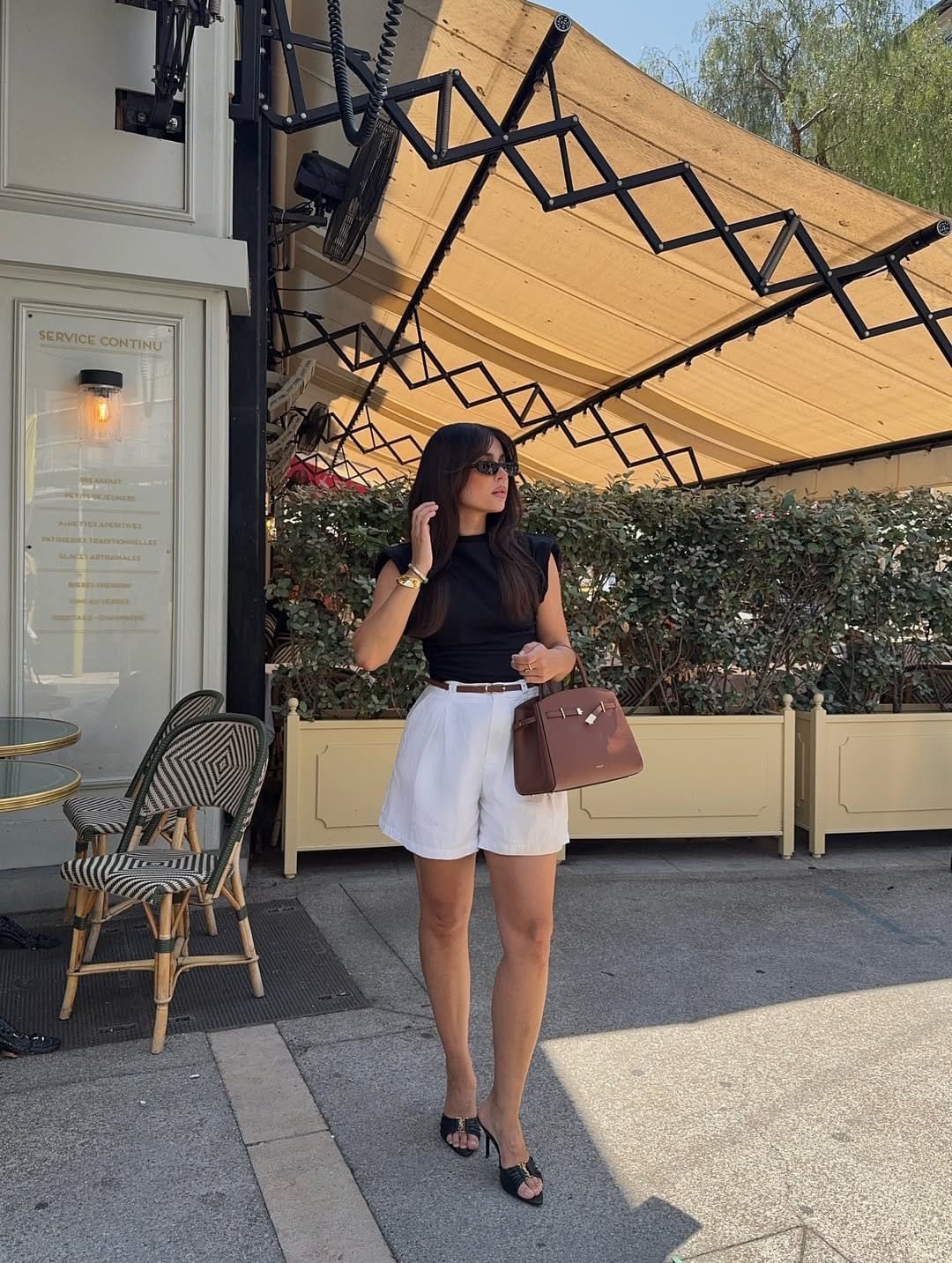 A fitted black cap-sleeve top with a subtle shoulder ruffle detail is tucked into high-waisted white tailored shorts, cinched with a slim tan leather belt, and finished with black strappy heeled mules, a burgundy structured top-handle bag, and a gold watch. The shoulder ruffle on an otherwise minimal black top is a tiny detail that adds just enough femininity to stop this simple two-piece from reading as too casual — it creates a moment of interest at the shoulder without adding any bulk. My personal pick for a warm May evening at a Parisian café when you want to look sharp with the minimum number of pieces.