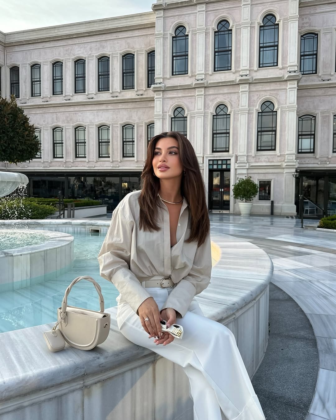 An oversized beige cotton shirt with voluminous sleeves and a deep open collar is worn as a belted dress over wide-leg white trousers, cinched with a wide cream leather belt, and finished with a small cream structured saddle-style bag and a delicate silver chain necklace. Belting the oversized shirt is the decision that makes this look — without it, two generously cut pieces in similar tones would read as shapeless, but the belt creates a waist and turns the shirt into a deliberately layered top rather than simply an untucked piece. I love this for a May day that moves from a cultural visit to an evening dinner without requiring a change of outfit.