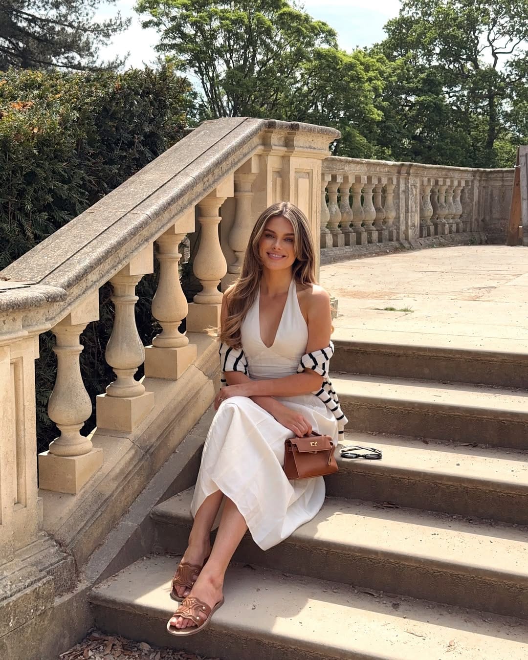 A white linen halter-neck midi dress with a deep V-neckline and a gently flared skirt is styled with a black and white striped cardigan draped over the shoulders, and finished with tan leather flat slides, a small tan structured Kelly-style mini bag, and loose waves. The striped cardigan draped over the shoulders is the layering detail that makes a simple white halter dress feel like a complete and considered outfit — it introduces pattern and a relaxed, slightly preppy quality that suits the in-between warmth of a May afternoon. What I love about this is how one borrowed layer transforms the entire mood of the dress without adding any complexity to the silhouette.