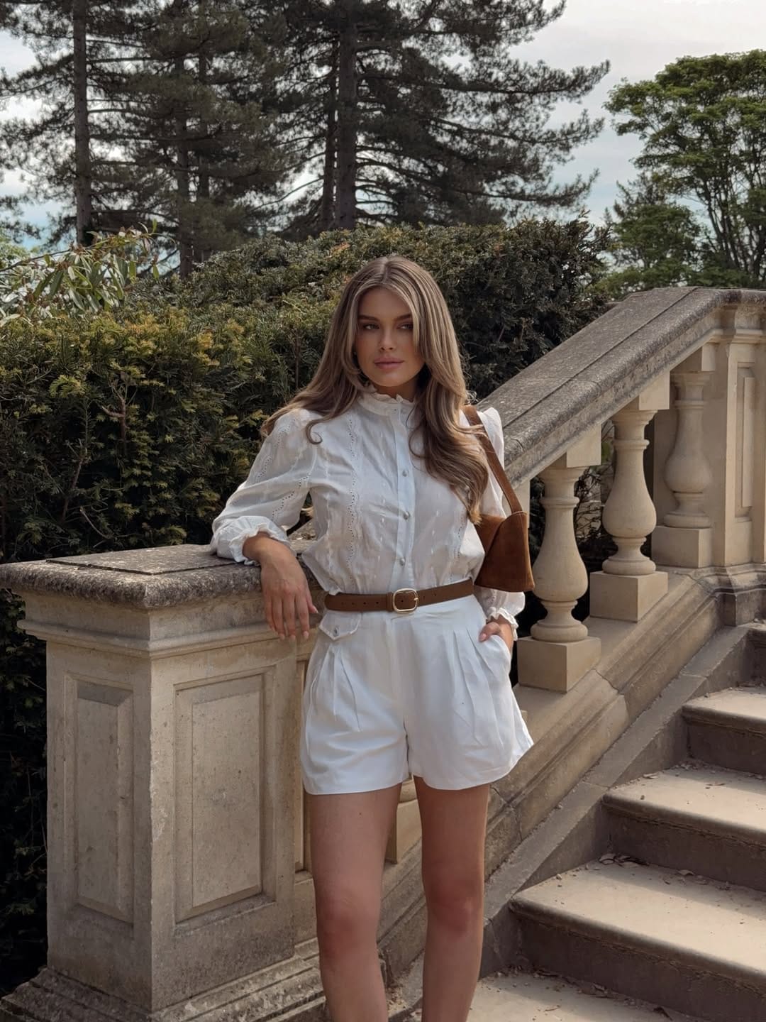 A white broderie anglaise long-sleeve shirt with a high ruffle neckline, puff sleeves, and delicate embroidered detailing is tucked into high-waisted white tailored shorts, cinched with a wide tan leather belt, and finished with a tan suede shoulder bag. The tan belt is the single element that holds this all-white combination together — it creates a warm earthy anchor at the waist that stops the head-to-toe white from feeling flat and gives the broderie fabric something to contrast against. I am obsessed with this for a May garden visit or a countryside afternoon when the setting is beautiful enough to deserve an outfit that matches it.