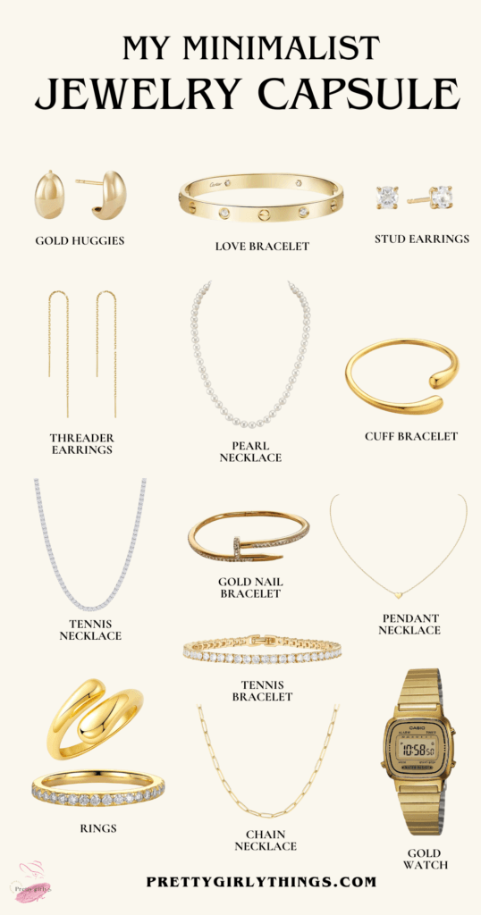 Timeless and effortlessly chic, a pearl necklace embodies classic sophistication. Whether you opt for a single pearl pendant or a full strand of pearls, this piece brings a graceful, polished touch to your minimalist jewelry capsule.