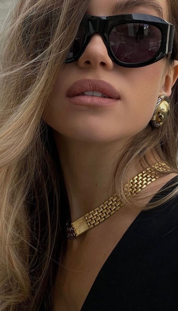 Bold gold jewelry takes any outfit to a new level of sophistication. In these looks, chunky gold necklaces, oversized hoop earrings, and statement pieces exude confidence and luxury. Paired with sleek sunglasses and minimalist makeup, these accessories perfectly embody opulence and boldness.