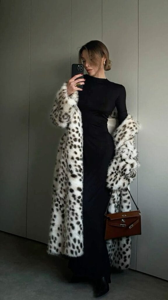 This stunning black bodycon dress perfectly embodies the mob wife aesthetic with its sleek and sultry design. Paired with a luxurious fur stole and a chic handbag, this outfit exudes elegance and confidence, making it ideal for evening events or upscale gatherings.