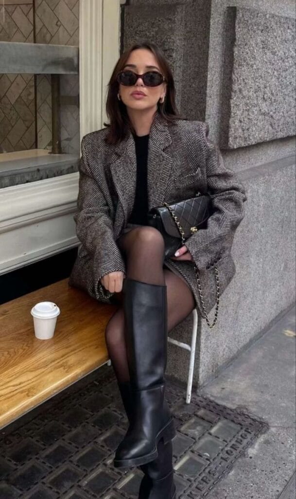 These outfits embody the Mob Wife aesthetic with bold sophistication. The first features a herringbone blazer, black boots, and a quilted bag, while the second pairs a tailored gray blazer and skirt with stiletto heels. Both exude timeless elegance and power.