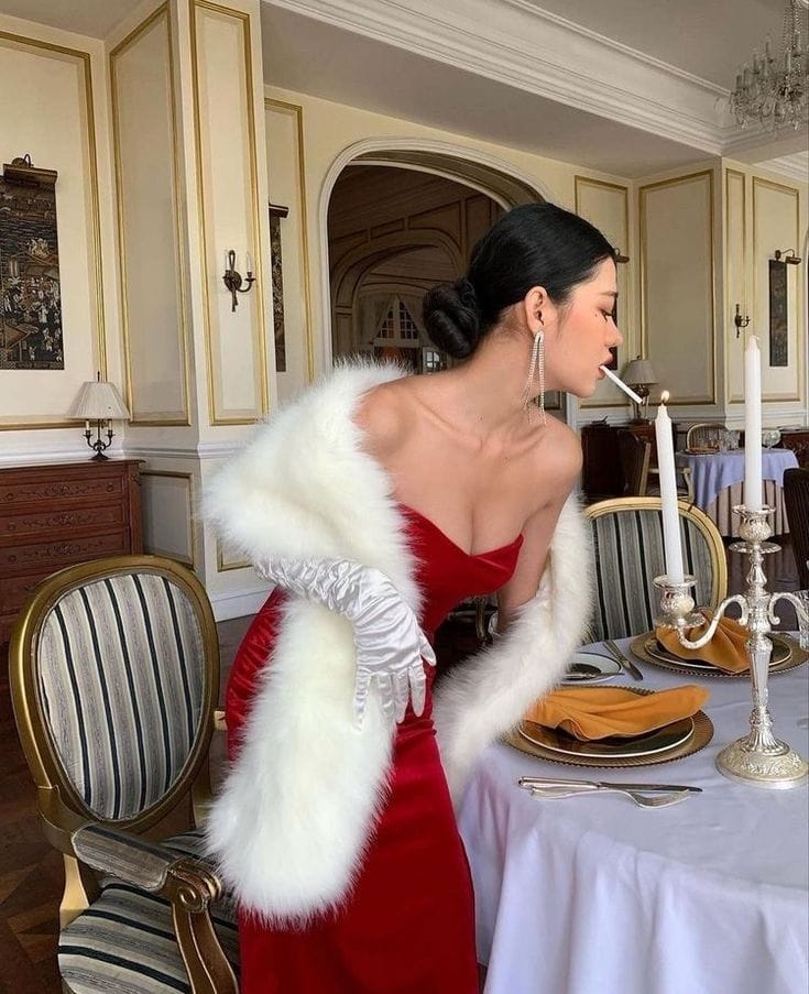 This bold red satin gown paired with an elegant white fur stole exudes vintage sophistication.