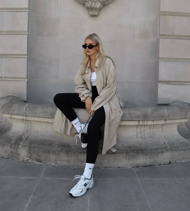 She’s keeping it chic in a light beige trench layered over a simple white crop top and high-waisted black leggings. White socks, New Balance sneakers, and cat-eye sunnies make it feel sporty but still super polished for a city day.