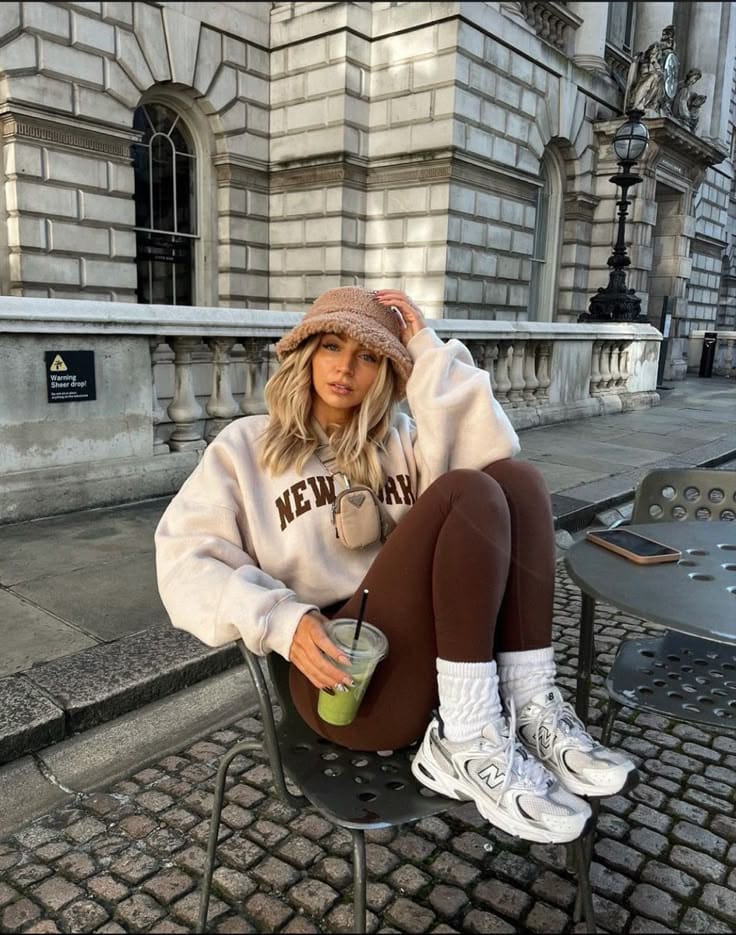 She’s going full cozy-girl in an oversized cream “New York” sweatshirt paired with chocolate brown leggings for a warm, autumnal vibe. Chunky New Balance sneakers, scrunched white socks, and a fuzzy bucket hat pull the whole laid-back café look together.