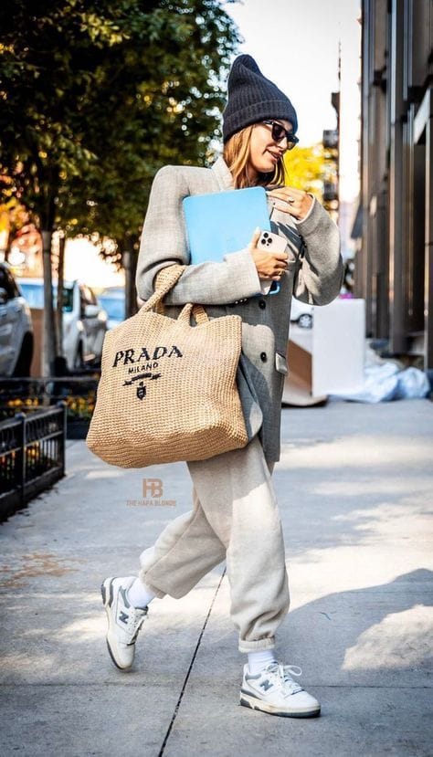 She’s strolling the city in a slouchy grey blazer layered over a matching grey sweatshirt and loose joggers for that elevated loungewear vibe. White New Balance sneakers, a chunky knit beanie, and oversized sunnies make it feel effortlessly cool and street-style ready.