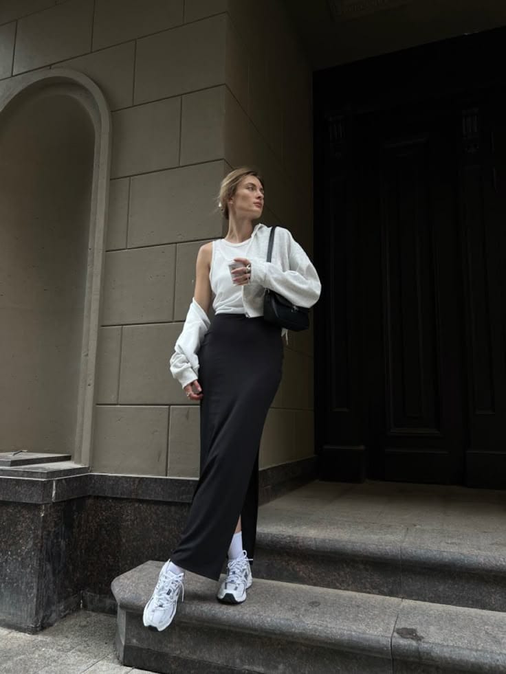 She’s keeping it clean and chic in a fitted white tank tucked into a high-waisted black maxi skirt with a subtle side slit. A soft cardigan draped over her shoulders, New Balance sneakers, and a simple black shoulder bag give the look that perfect mix of polished and laid-back.
