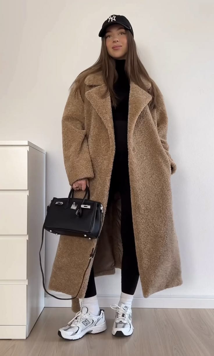 She’s bundled up in a long, camel teddy coat layered over an all-black base of a fitted top and leggings, giving that cozy-but-polished winter vibe. White crew socks, New Balance sneakers, a structured black handbag, and a baseball cap keep the look sporty and super city-ready.