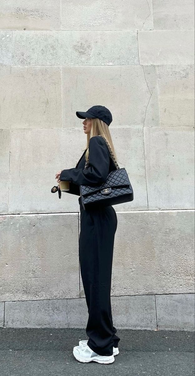 She’s in a head-to-toe black look featuring a relaxed blazer-style jacket and loose, slouchy trousers for that effortlessly cool, model-off-duty feel. The quilted chain-strap bag, matching black cap, sunglasses, and chunky white New Balance sneakers make it the perfect minimalist street-style outfit.