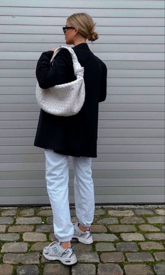 She’s keeping it effortlessly cool in a structured black blazer paired with relaxed white joggers for that perfect high-low mix. Chunky New Balance sneakers, a slouchy woven shoulder bag, and sleek sunnies make the look feel minimal but super intentional.