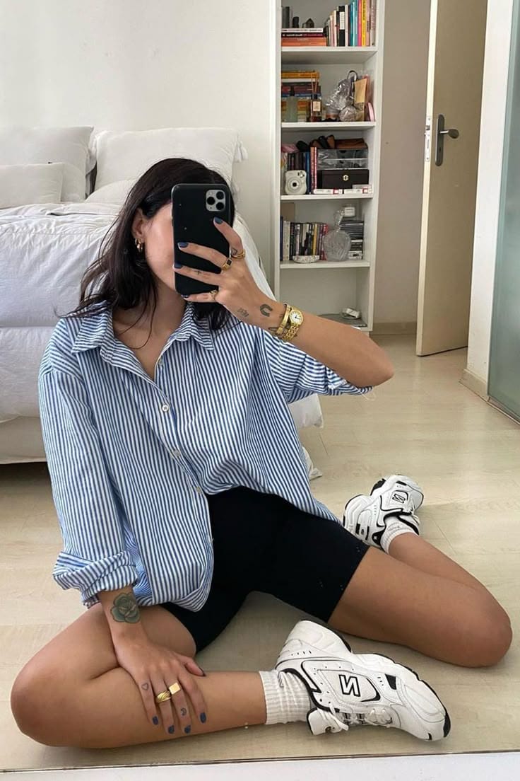 She’s lounging in an easy blue-and-white striped button-up styled with simple black biker shorts for that cool, at-home-but-still-cute look. White New Balance sneakers, scrunched socks, and stacks of gold jewelry make it feel effortlessly trendy without trying too hard.
