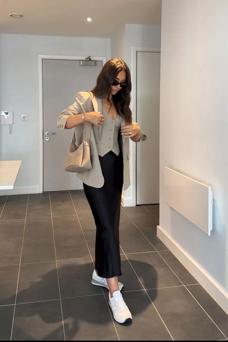 She’s dressed up in a light beige blazer over a matching buttoned vest and low-cut top, paired with a silky black midi skirt for that polished, fashion-editor vibe. New Balance sneakers and a soft neutral shoulder bag keep the whole outfit feeling modern, comfy, and totally wearable for a busy day.