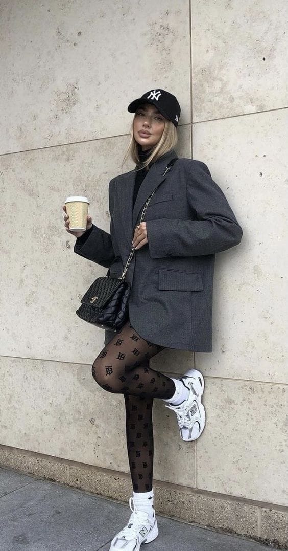 She’s serving major city-girl energy in a charcoal oversized blazer layered over a black turtleneck and sheer logo tights. The look gets a sporty twist with white New Balance sneakers, a black baseball cap, and a quilted crossbody bag that keeps everything chic but playful.