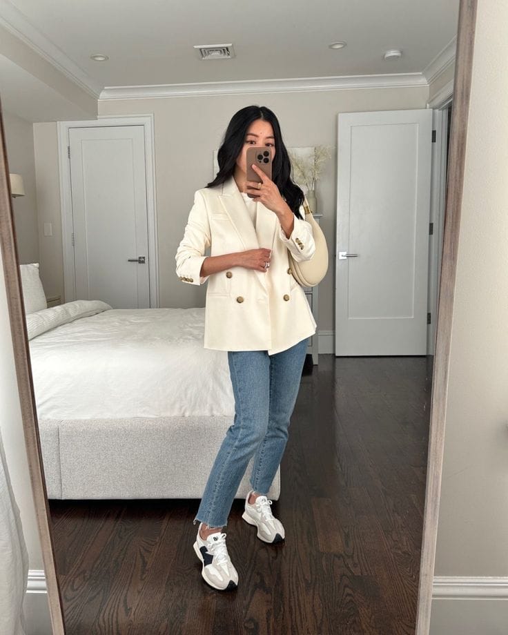 She’s keeping it classic in a structured cream double-breasted blazer paired with straight-leg blue jeans for that smart-casual, “meeting then brunch” vibe. Chunky New Balance sneakers and a matching cream shoulder bag make the look feel modern, comfy, and perfectly put-together.